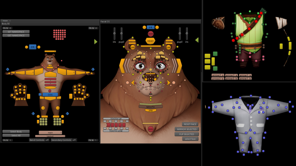 1 Maya rig (Render ready). Studio Library. Huntsman and Suit outfits. Picker. IK/FK snapping script